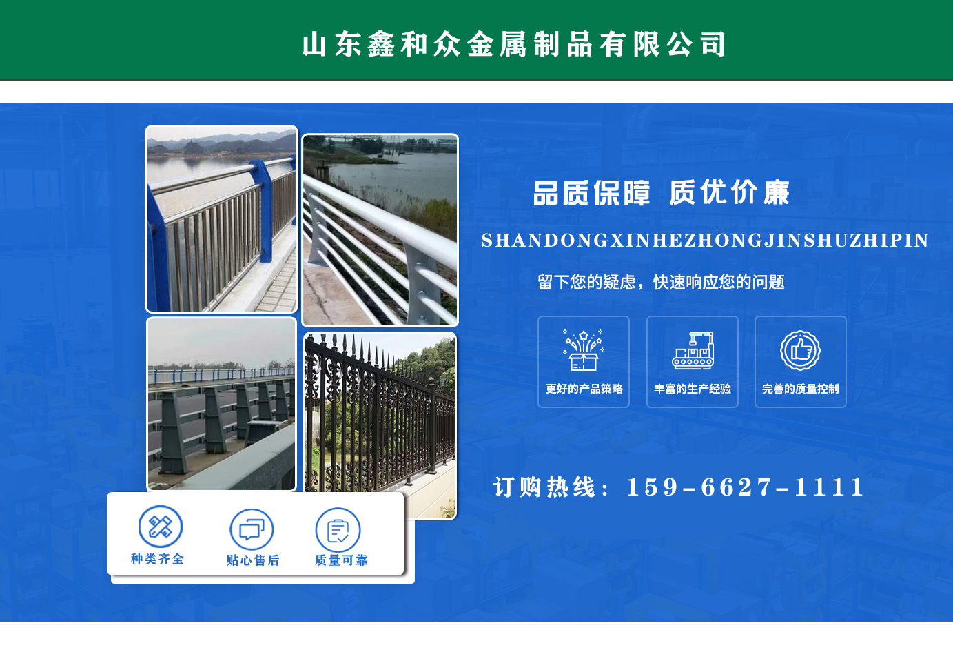 山東鑫和眾金屬制品有限公司主要產(chǎn)品有防撞護欄,橋梁護欄,道路護欄,河道護欄,不銹鋼護欄等護欄。提供設計方案,一站式定制,包您滿意價格優(yōu)惠,歡迎來電咨詢! 公司常年從事銷售護欄防撞護欄,橋梁護欄,道路護欄,河道護欄,不銹鋼護欄,橋梁鋼護欄,河道燈光護欄等。產(chǎn)品廣泛應用于橋梁、河道、旅游景區(qū)、道路、公路、公園、小區(qū)、景觀、道路防撞等領(lǐng)域?! 」井a(chǎn)品均采用優(yōu)質(zhì)不銹鋼材料,符合相關(guān)標準。各種型號不銹鋼復合管及護欄,質(zhì)量嚴格把控。產(chǎn)品強度高、耐腐蝕、焊接牢固、抗沖擊、性能好,防撞護欄結(jié)構(gòu)簡單、美觀實用大方?! g迎前來訂購!...